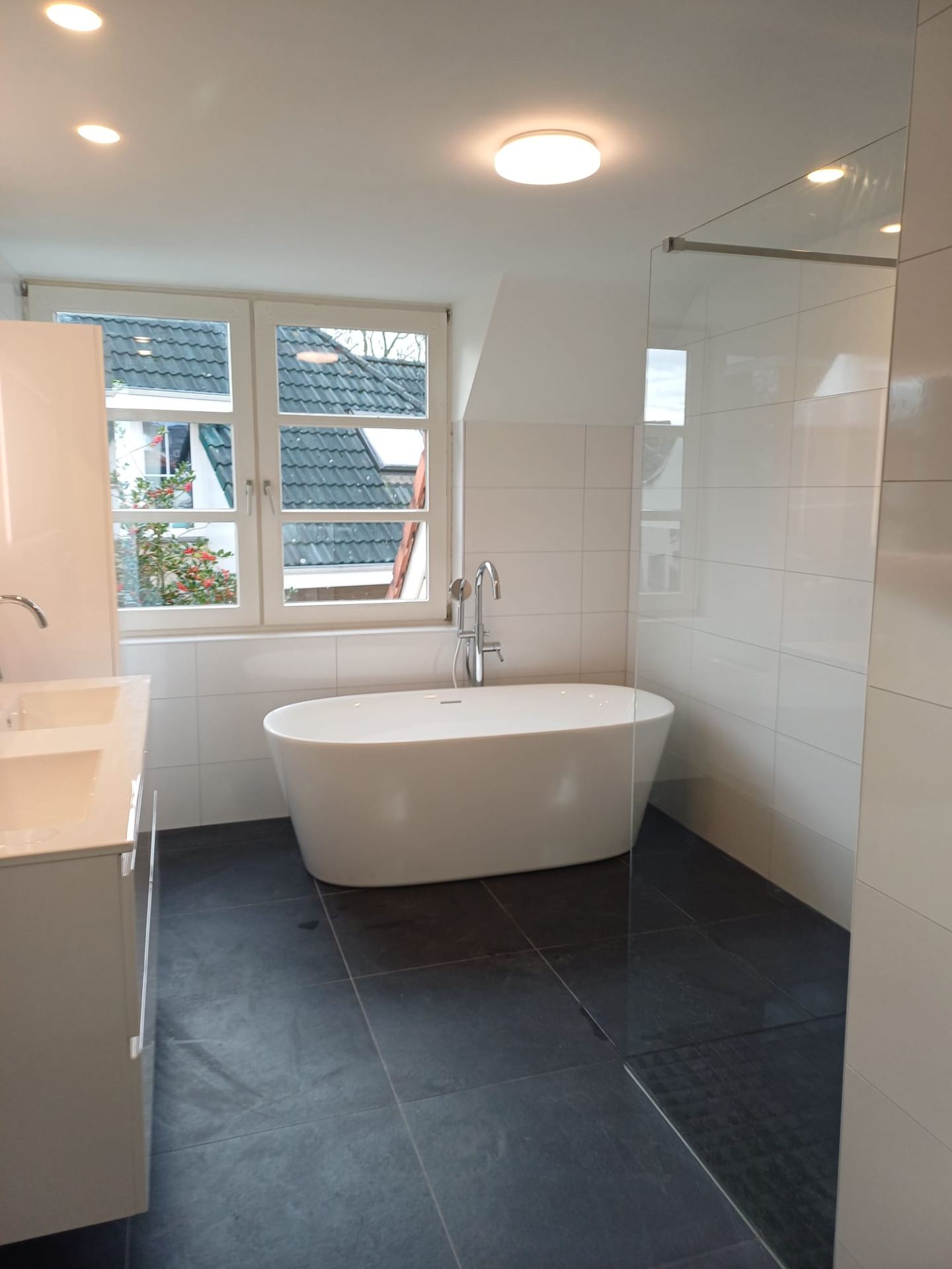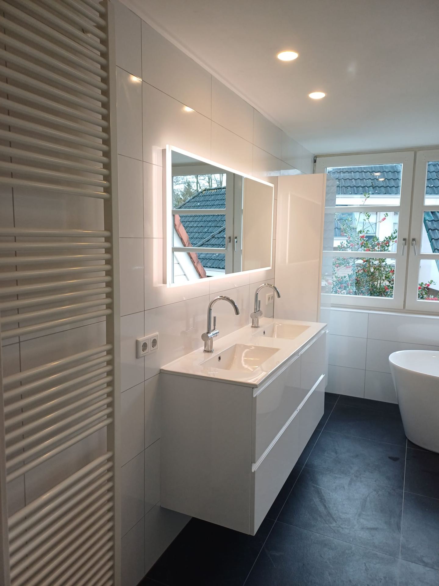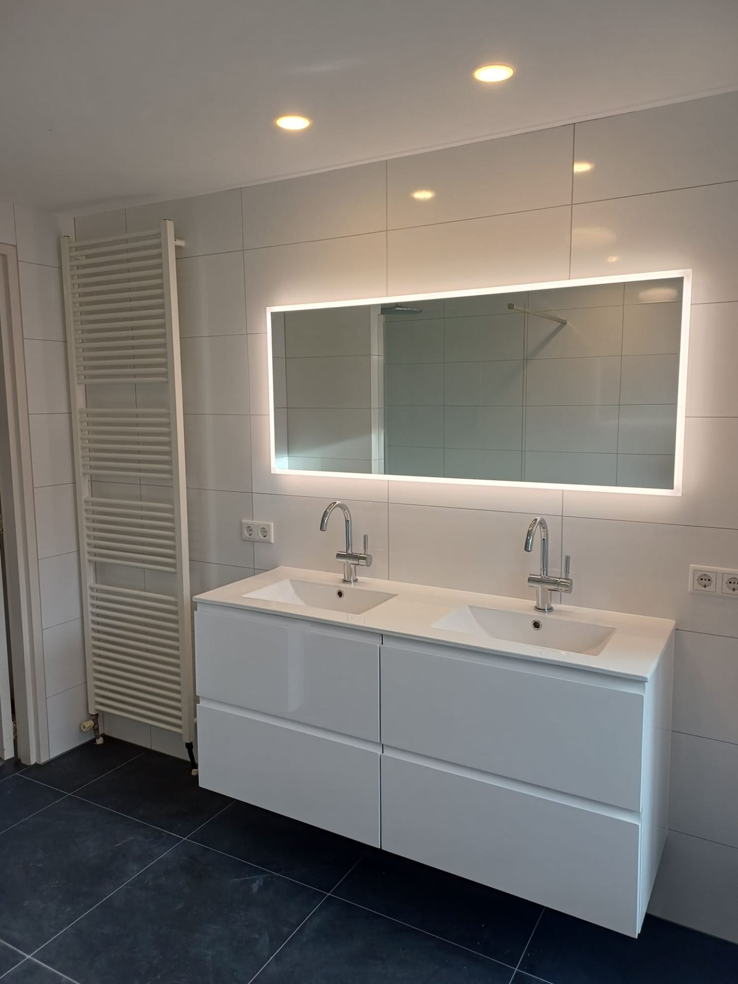 Voor een klant in Veldhoven de badkamer een nieuwe look mogen geven. Deze ruime badkamer is uitgerust met een vrijstaand bad, een dubbele wastafel met led-spiegel en een ruime inloopdouche.